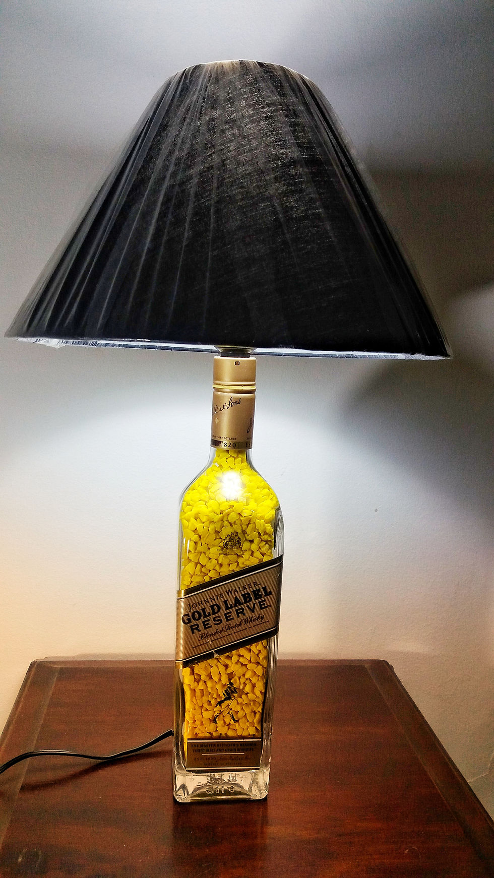 Abajures produzidos através de reciclagem de garrafas de bebidas nacionais e importadas, que iriam prejudicar o meio ambiente. Transparentes e/ou coloridas com rótulos originais e com decoração interna com pedras/bolinhas de gude e sementes de pau brasil.